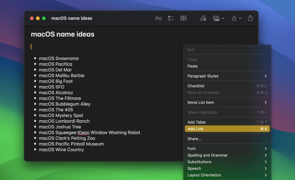 Creating a link from one note to another is fairly simple on macOS Sonoma. You just need to know one keyboard shortcut: Command K.