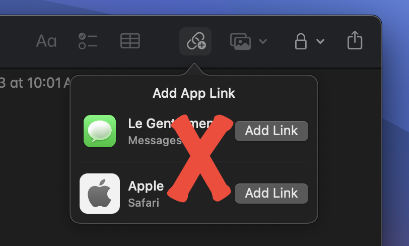 Side note: Notes on the Mac includes a button with a link icon called Add a Link. This lets you add links to other apps, like conversations in Messages. There’s not yet a toolbar button for adding a linked note.