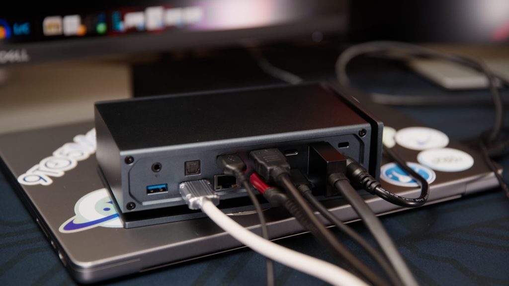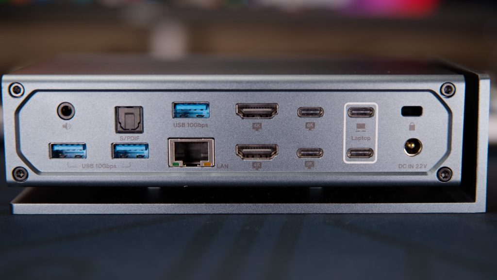 The back of the device has a lot of connectivity that you’ll leave connected at all times, including the dual USB-C upstream ports, your HDMI ports, power, audio, and networking. For your display outputs, the 40Gbps USB-C ports can each be used to output at 6k60Hz, while the HDMI ports max out at 4k60Hz. The USB-A ports are useful for accessories like wired mice and keyboards or even large external hard drives, which often still use USB-A.