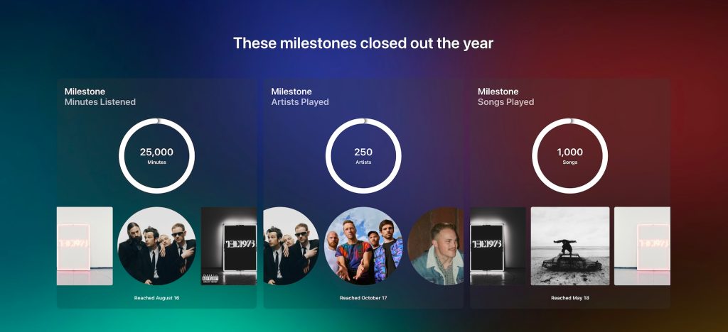 Scroll down and you can also view a breakdown of your top playlists as well as more thorough lists of your top albums, songs, and artists. There’s also a new “Milestones” feature that shows when you crossed certain thresholds for the year.