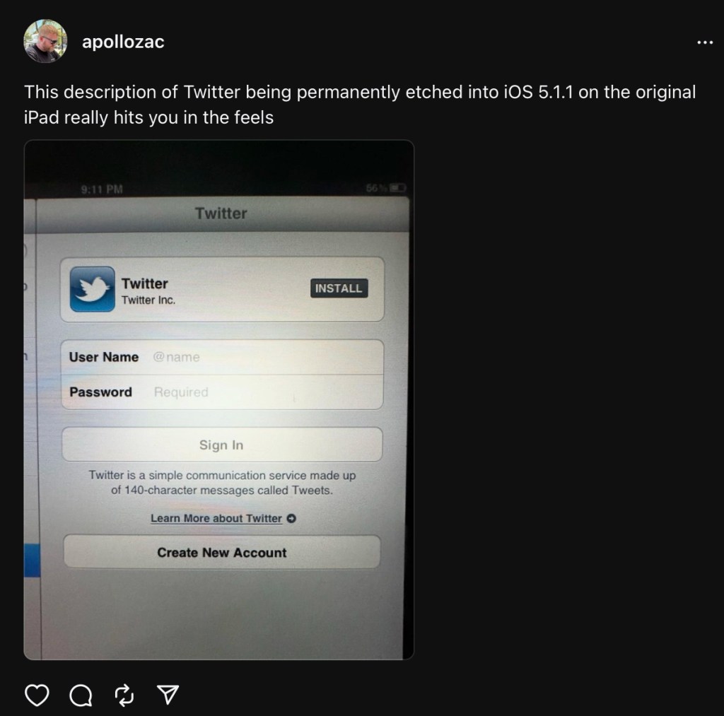 How’s this for a blast from the past? Last night, I fired up the good ol’ iPad 1 and came across this gem of a relic. The original iPad beautifully encapsulates legacy Twitter as if it were written in stone on a cuneiform tablet.