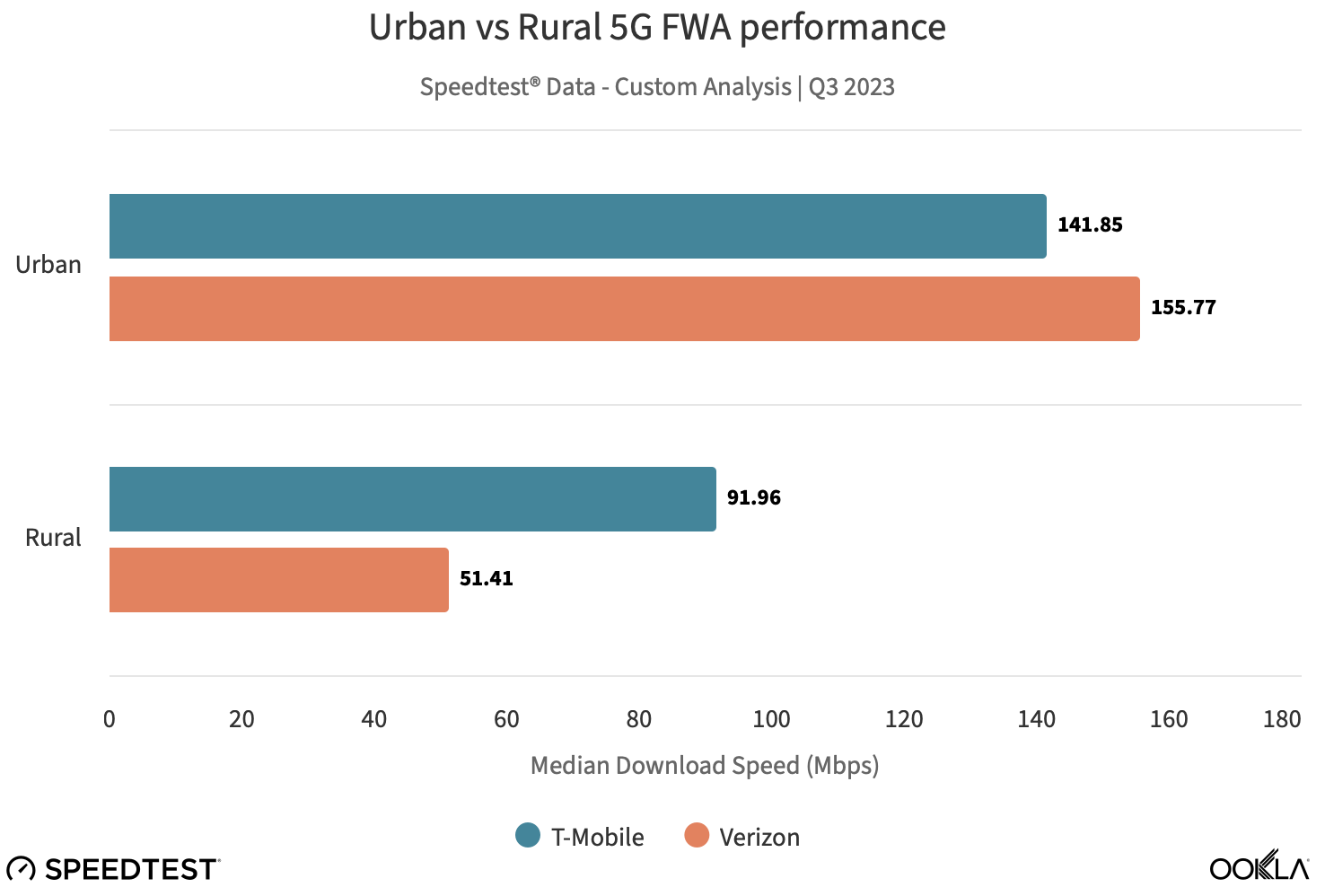 For urban customers, Verizon was slightly faster for download speeds, with a median of 155.77 Mbps.