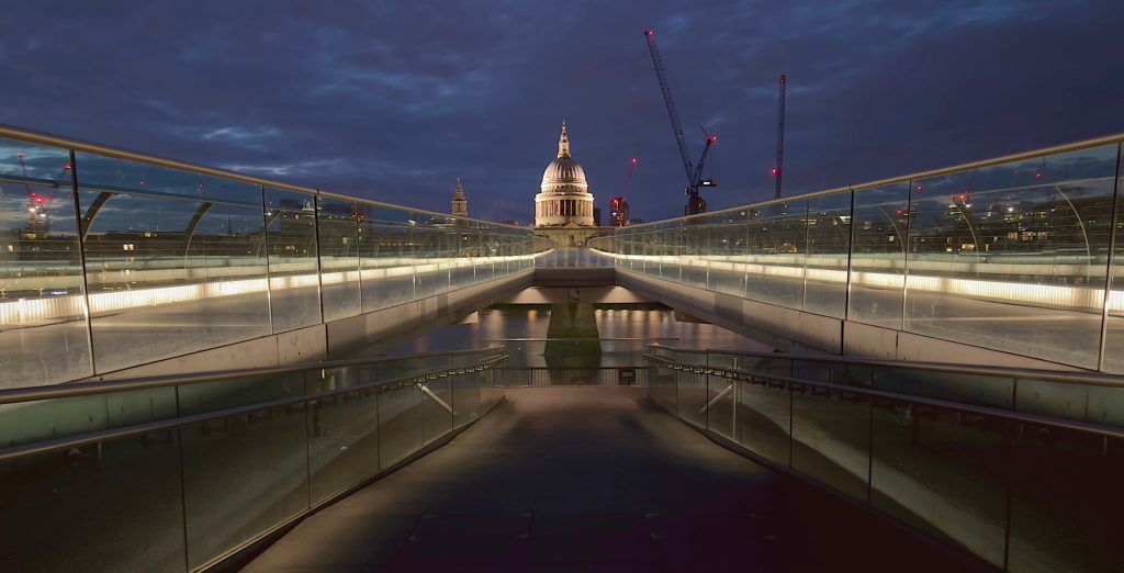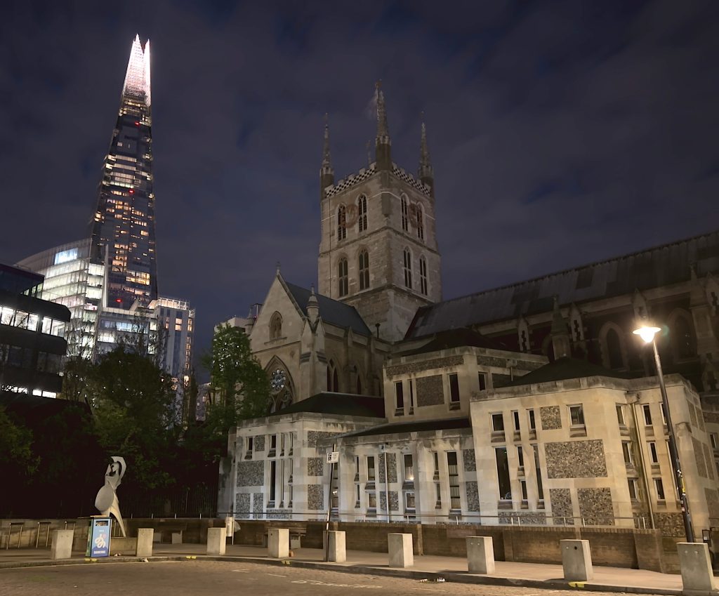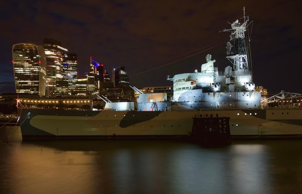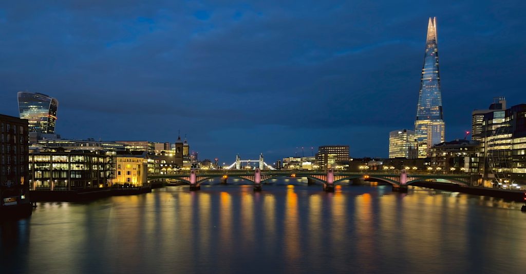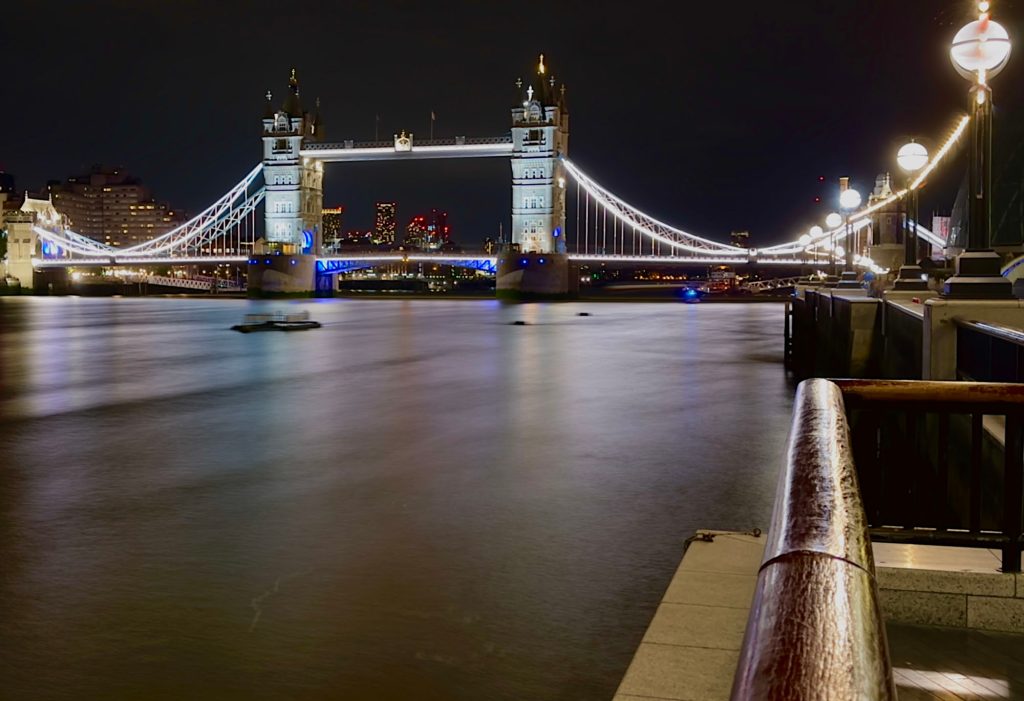 This does a great job at capturing the reflections of the colored lights from London Bridge and riverside office blocks.