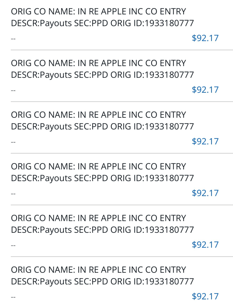 On social media, Michael Burkhardt shared a screenshot showing six payouts of $92.17 each. Multiple other iPhone users have also chimed in to say that they’ve received their payments today.