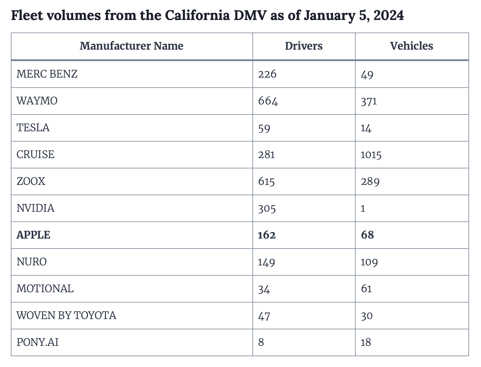Here’s how Apple compares to the competition for autonomous vehicle testing: