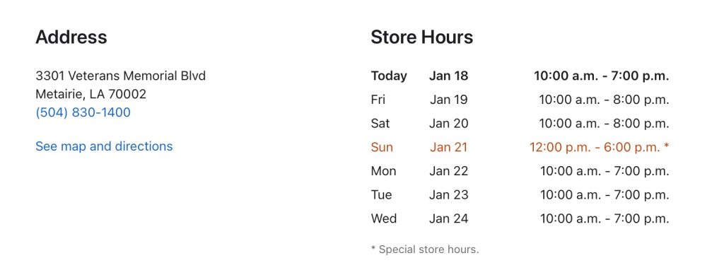 The upcoming early closure appears to affect Apple Store locations with extended hours on Sundays. Specifically, shops that are typically open until 7 p.m. are closing their doors at 6 p.m. instead. Stores that already close at 6 p.m. are not affected. MacRumors’ Joe Rossignol first reported the early closures.