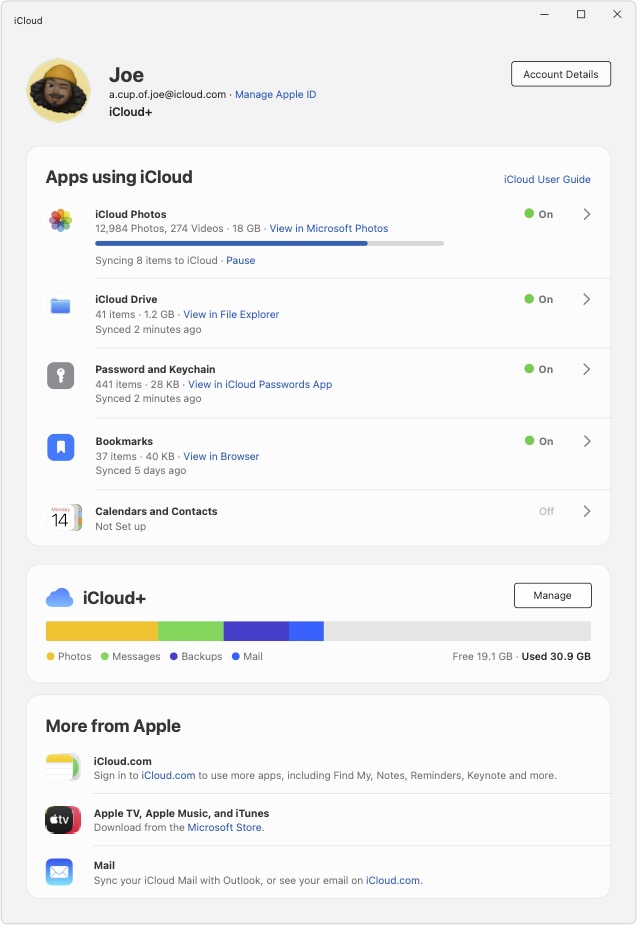 Let’s start with the newly designed iCloud for Windows. The new look is meant to make it more clear where to access it on a PC. It also focuses on making it clearer what content syncs with devices.