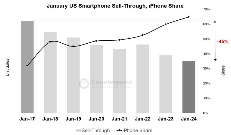 The report shows that US smartphone sales for the start of the year continued a long-term downward trend in each new year, with a 45% decline since a peak in 2017 …