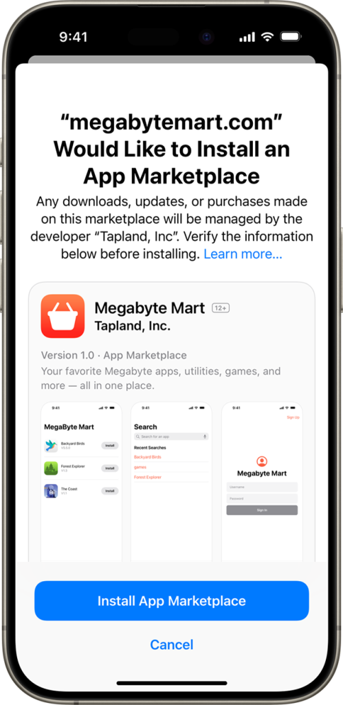 When pressing on a link to install an app marketplace, a standard system sheet will confirm if you want to proceed. If you do not install an app marketplace at all, it is not possible to install apps sourced from outside of Apple’s App Store walled garden.