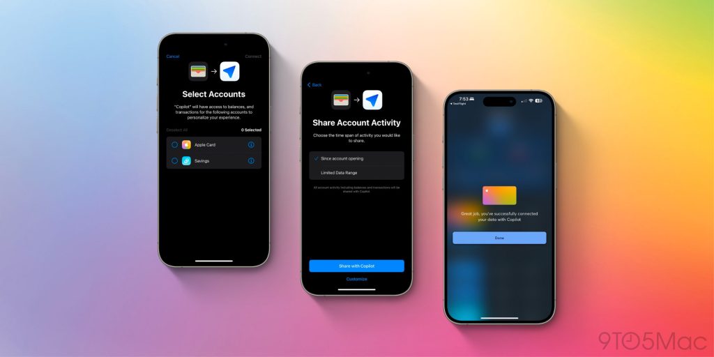 Like always, privacy is at the forefront of this integration as well. Face ID is required during the process of linking your Apple accounts to Copilot. Copilot does not (and never will) sell or share any of your personal information. None of your data ever leaves Copilot’s system, and the app’s infrastructure is built on the same platform used by leading financial companies worldwide.