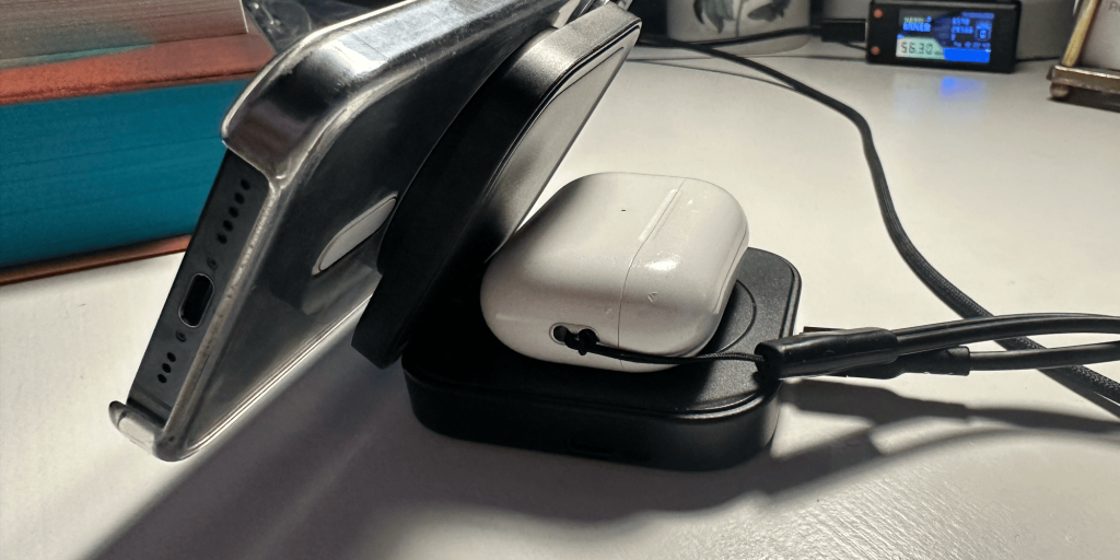 You can charge your iPhone while it is lying flat or at an angle. If it’s laying flat, you want to charge your AirPods simultaneously, but it’s flexible enough to work in various use cases. If you want to pull it out on a train or plane, sit it on your stay, and watch a movie, it’ll hold it at a perfect angle