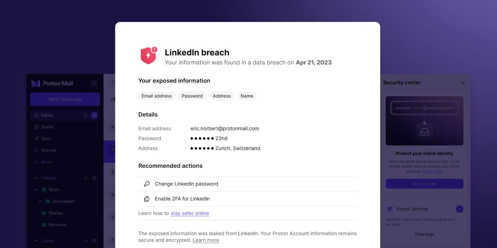 The new feature will describe what breach a third-party account of yours using a Proton email was in and share specifics like if the password was leaked, your address, etc.