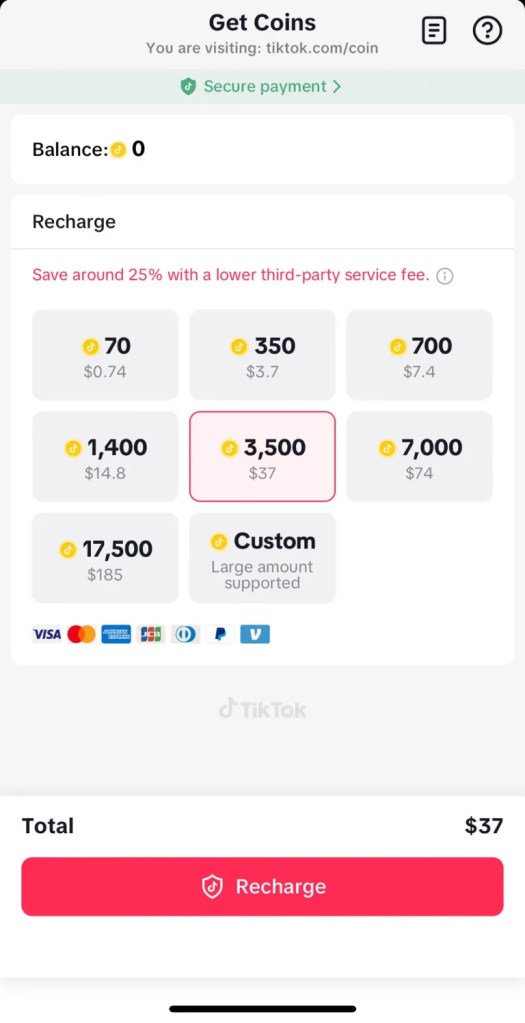 Users who follow the provided link are taken to the website for buying coins: tiktok.com/coin. From this web view, they can pay using a variety of methods, including Apple Pay or debit or credit cards. The website reminds users that purchases made directly with TikTok will save them around 25% “with a lower third-party service fee.”