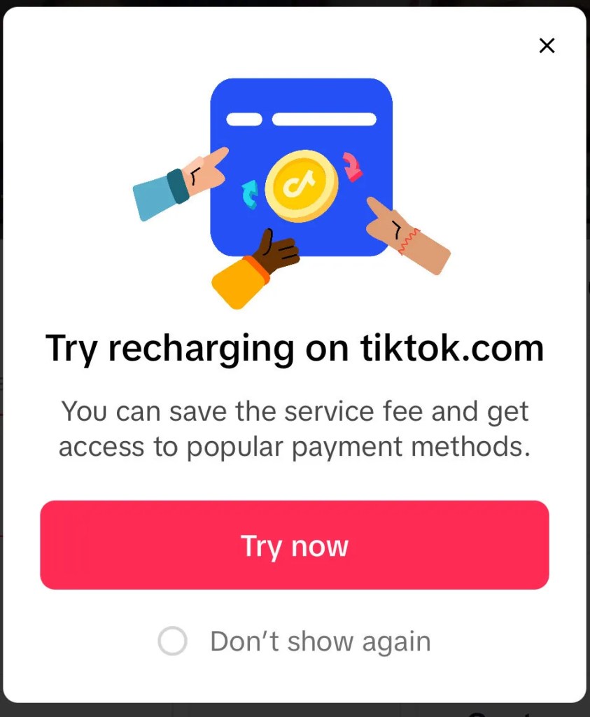 In some cases, users are shown a screen that includes a message such as “Try recharging on tiktok.com to avoid in-app service fees” followed by a “Try now” link. Other times, they may get a pop-up that says “Try recharging on tiktok.com” with another message about the potential savings. This one reads, “You can save the service fee and get access to popular payment methods,” and is followed by a big, red “Try now” button or a less prominent option that says “Don’t show again.”