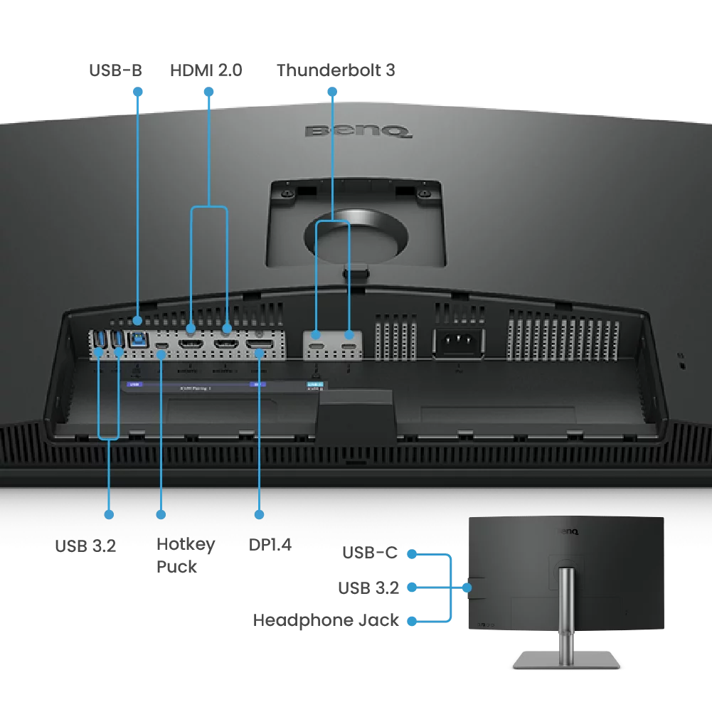 I also have a Thunderbolt external drive attached to the BenQ monitor for Time Machine backups that mounts when I’m connected by the cable to the monitor from my Mac. USB-A and USB-C ports positioned on the right side are handy for data transfer and charging devices.