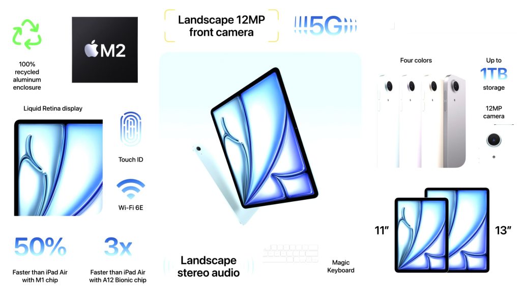 - iPad Air 6: Redesigned model available in 11-inch and 13-inch sizes, landscape front camera, more