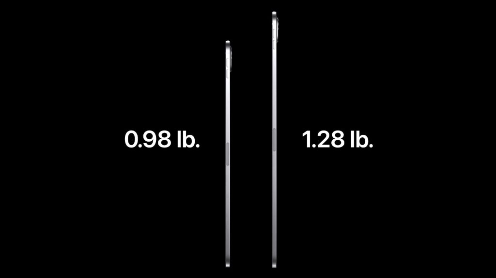 - Available in 11-inch and 13-inch screen sizes. 11-inch iPad Pro is 5.3 mm and weighs .98 lb. The 13-inch is 5.1 mm thin and weighs 1.28 lb.
