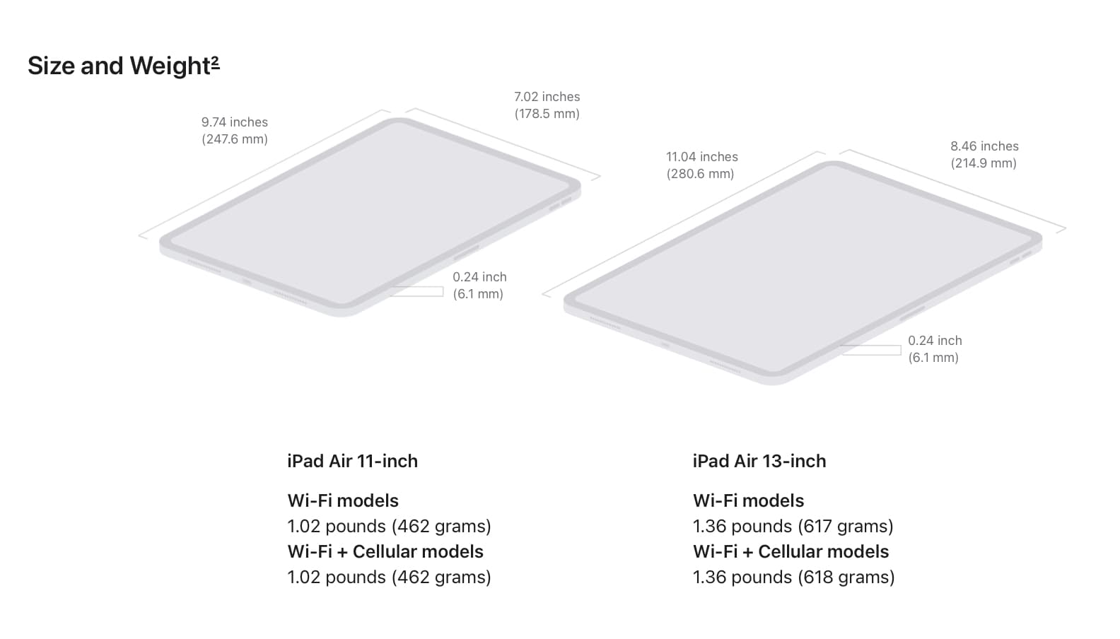 The 11″ M2 iPad Air is identical in size and weight to the M1 version. But here’s how the new 11 and 13″ models compare in weight and dimensions: