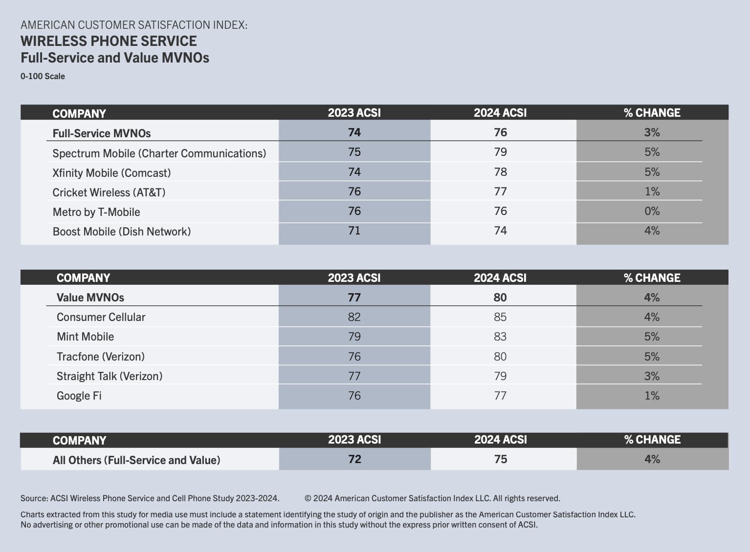 ACSI also researched full-service and value MVNOs. The latter ended up having the highest average customer satisfaction with 80/100 (compared to 76/100 for major carriers).