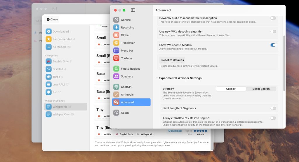 - Updated to the latest Whisper C++ engine, now with Flash Attention (activate in Settings > Advanced).