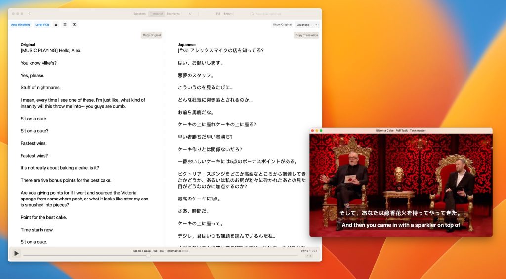 A new video player is the flagship feature of MacWhisper 8. This greatly improves the experience when transcribing audio from video files.