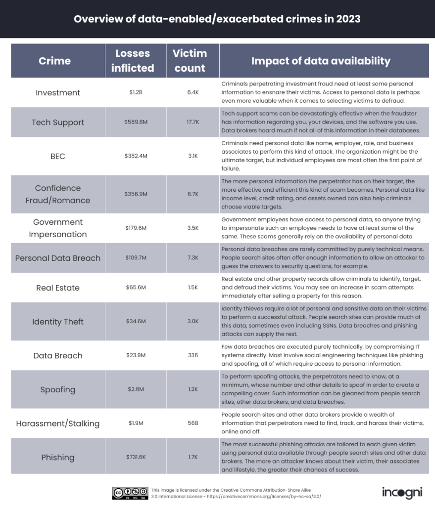 The Incogni researchers identified 12 crime categories (out of 30) that may be made possible or worse if criminals have access to the information data brokers deal with. The chart the researchers put together identifies those categories and provides some striking examples: