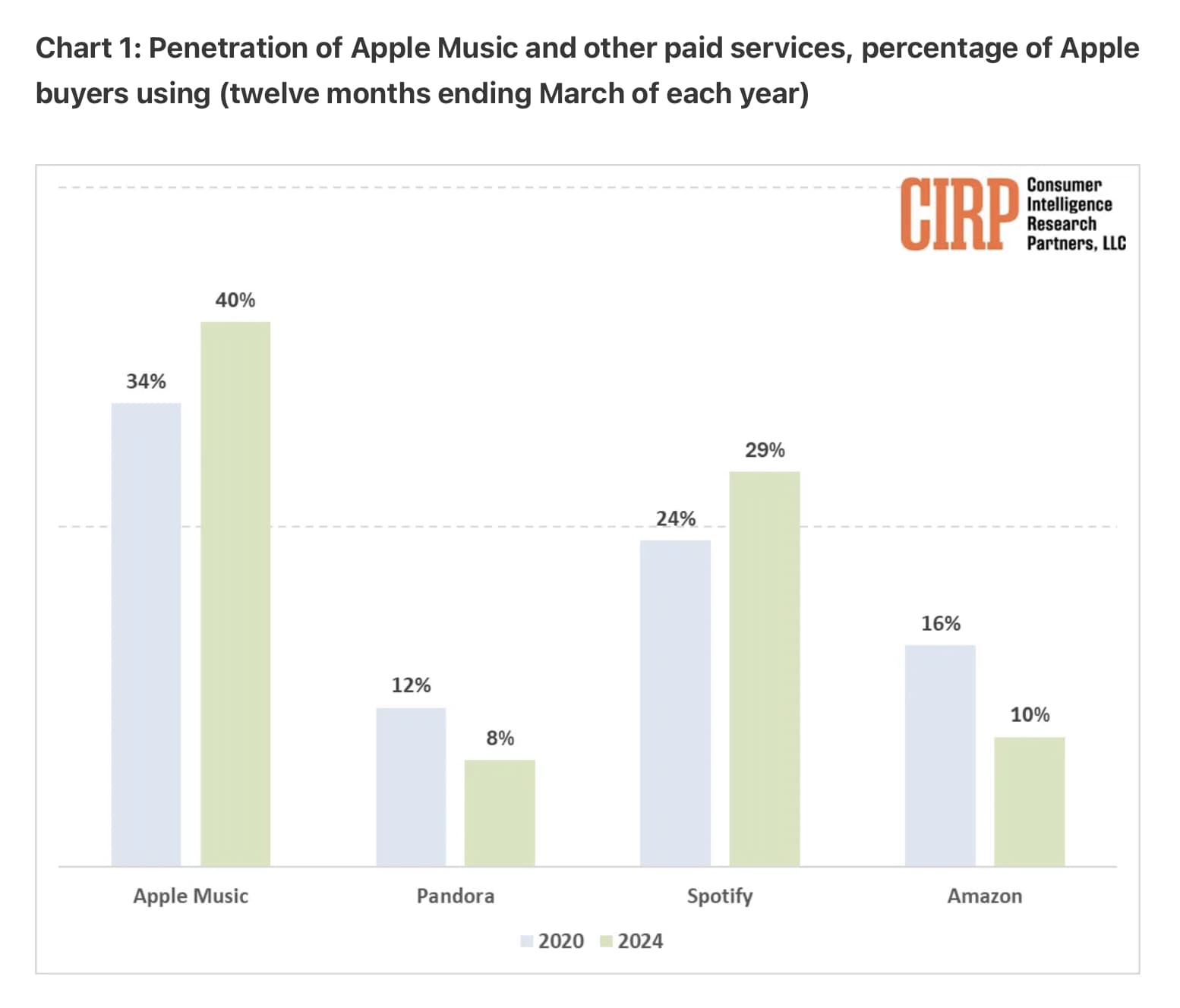 40% of Apple owners say they use Apple Music compared to 29% who use Spotify. And Apple has a very slight edge on growth too, increasing subscribers by 6% from 2020-2024 while Spotify saw growth of 5%.