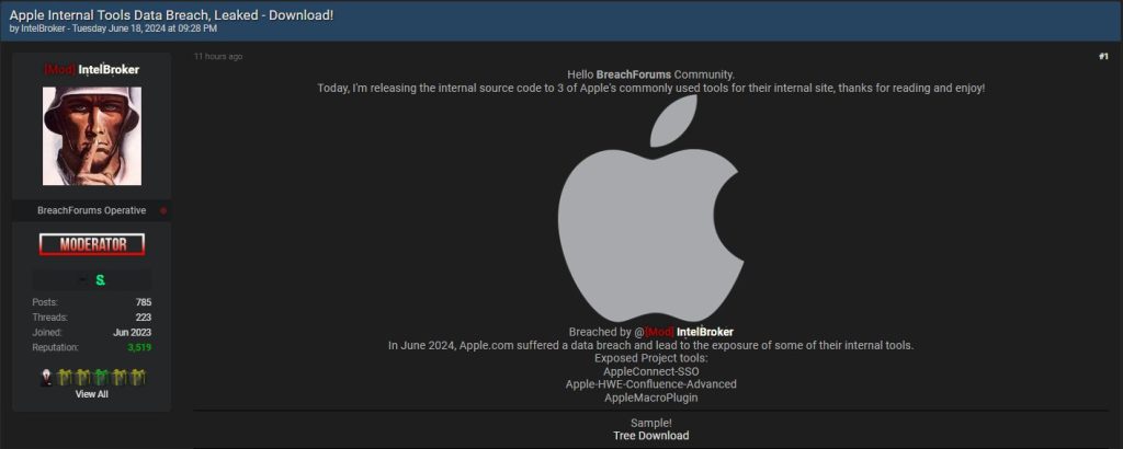 IntelBroker did not provide any further details in the post. It appears that the data could be for sale, though it is unclear. Nonetheless, it is important to emphasize that this alleged breach is localized internally and has no apparent impact on Apple customer data.