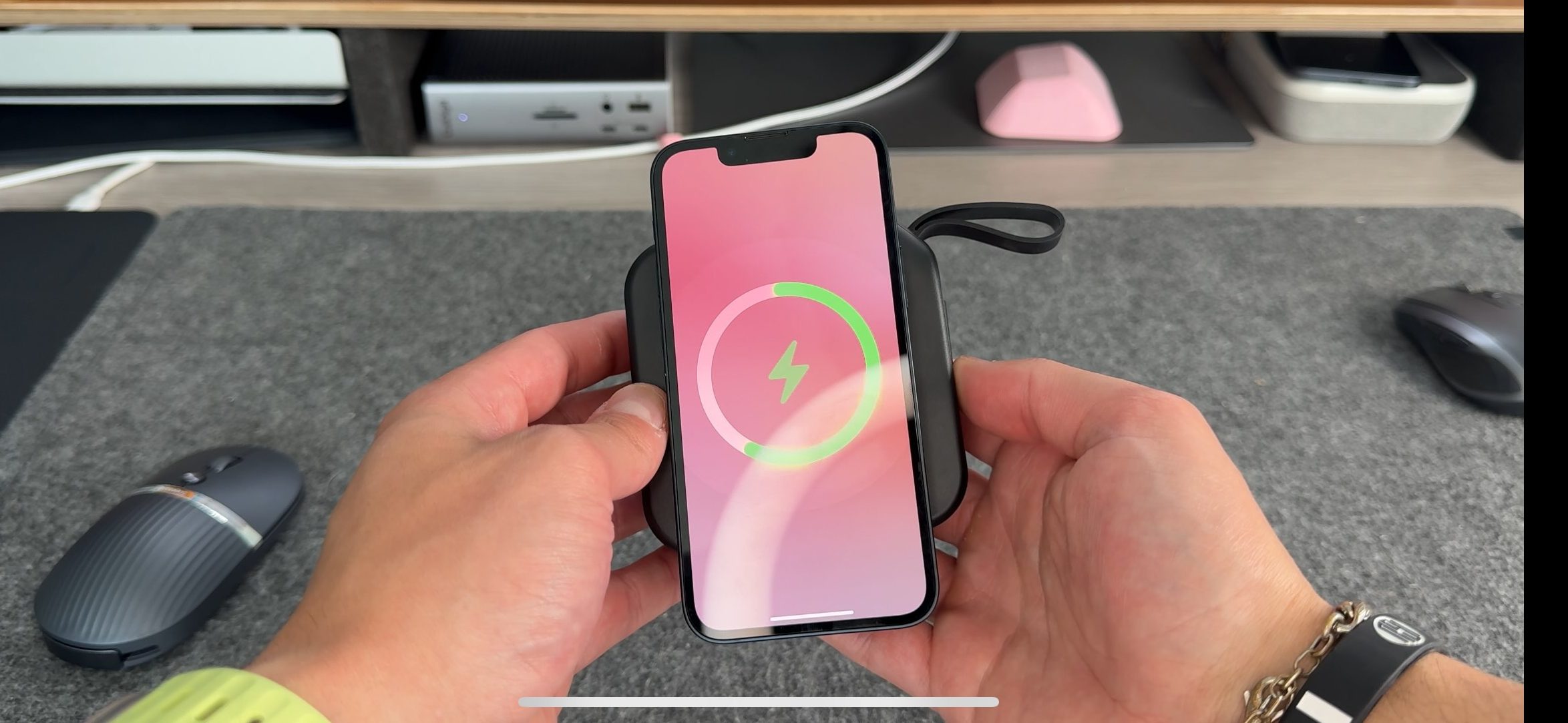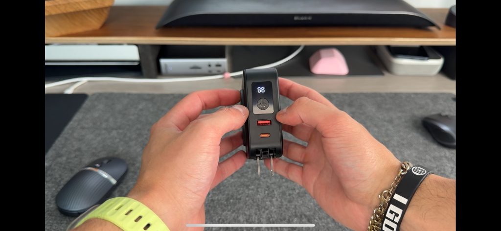 So, how is this a 5 in 1 charger? Firstly, it looks and acts as a typical wall charger. It connects to any AC outlet and has a USB-C and USB-A port that outputs 20W. Charges of this size typically can charge at higher wattage, but since this is only for an iPad, the 20W is more than enough, especially considering everything else. Not only does it charge your plugged-in devices, but it also houses a 10,000mAh battery that is constantly charging itself when it’s plugged into the wall. It doesn’t stop there; then it has two short built-in cables, a USB-C cable, and a lightning cable to charge your devices on the go. It also has a Magsafe puck on its side that supports up to 15W of charging. Then the last two things to mention are that it has a small kickstand for your phone and an LED screen that gives you the battery percentage of the power bank.