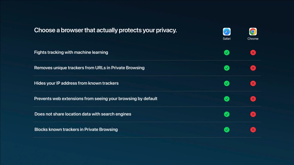 Safari, meanwhile, offers several privacy protections to keep you and your data safe while browsing the web. One key feature is preventing Intelligent Tracking Prevention. Apple explains: