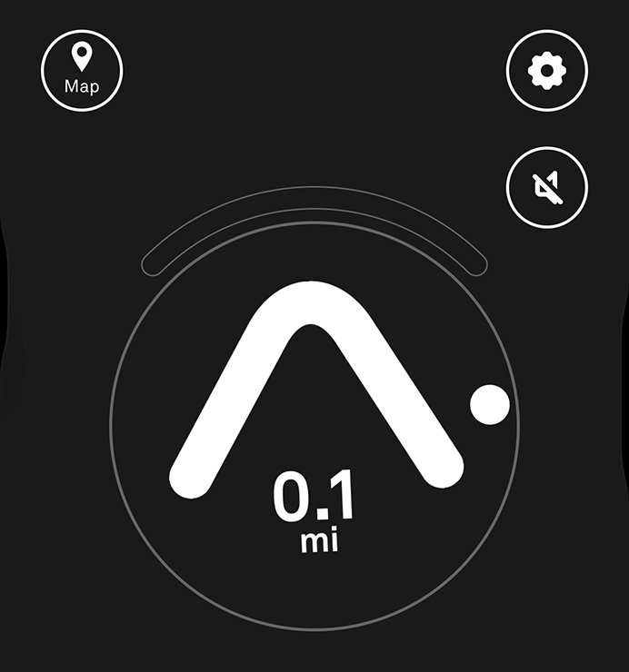 With this, the app simply draws a straight line between your starting point and your destination. While you can overlay this on a map, you’d normally combine it with the arrow display. Instead of looking at a map, you’re just looking at an arrow pointing toward your destination. The arc at the top is a curved progress bar.