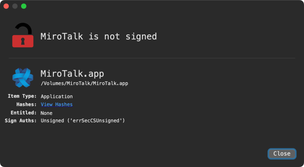 Security researcher and author Patrick Wardle analyzed the malware in a fairly comprehensive and hilariously titled blog post on Objective-See. Wardle found that hackers were most likely posing as job recruiters, tricking victims into downloading what appeared to be the legitimate video conferencing platform MiroTalk, hints the “MicroTalk.dmg” disk image file name, but was actually a clone containing hidden malware.
