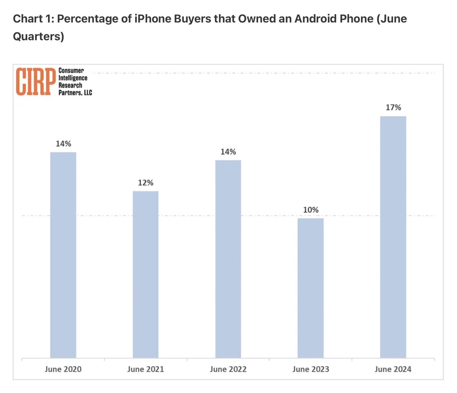 According to CIRP’s new data, the percentage of new iPhone buyers coming from an Android device jumped to a 5-year June quarter high of 17%. That’s almost doubled from 10% in June 2023.