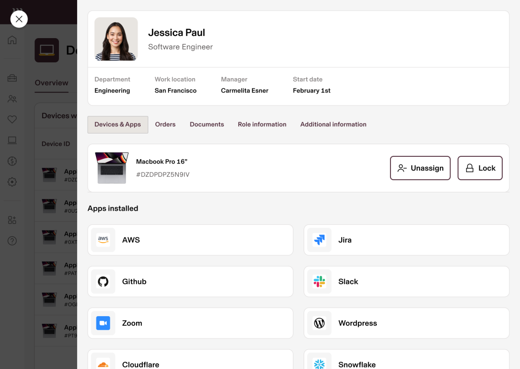 Zero-touch deployment. Automatically configure laptops with the right software, access, and security settings for each user’s role. Rippling makes it simple to implement additional security measures like device trust and endpoint protection.