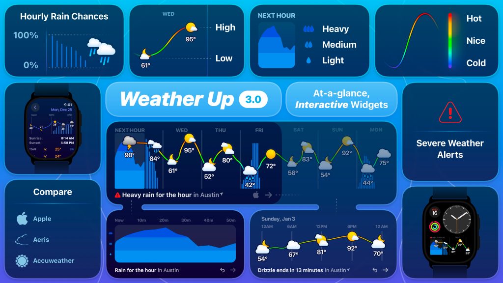 Weather Up comes to the Apple Watch too. The new app is designed specifically for watchOS 10 with a modern look that fills the display. You can put Weather Up on your watch face so you always know what’s up with the weather. You can also easily switch between data from Apple, Aeris, and Accuweather — three weather apps in one.