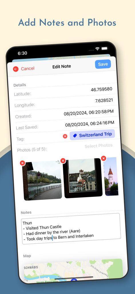 Pyxis supports iCloud Sync, allowing your notes, photos, and tags to all be available across all of your devices. The app also doesn’t require your location to function, as you can choose to drag and drop pins, although it does make things easier. It also has features to search nearby locations to add to your collection once you share your location.