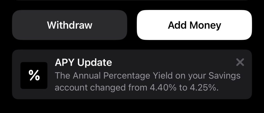 Apple and Goldman Sachs are cutting the interest rate offered by Apple Card Savings Account from 4.4% to 4.25%. The move was announced in push notifications sent to Apple Card users on Tuesday evening.