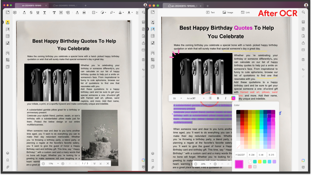 PDF to Word, Excel, PPT, etc. UPDF ensures that the page content is not lost or omitted, with a very accurate restoration of fonts, sizes, and colors. The OCR feature can also convert scanned PDF into editable text in any language.