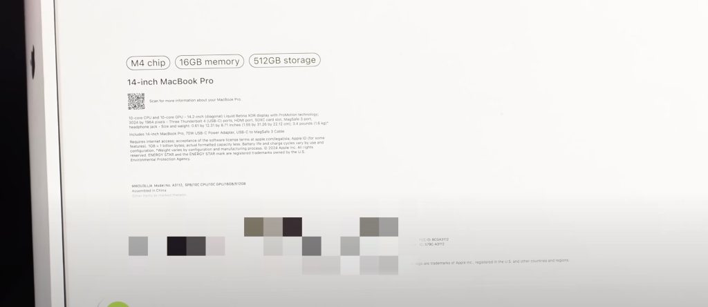 The packaging also shows that this M4 MacBook Pro has 512GB of storage and 16GB of RAM, along with three Thunderbolt 4 ports, an HDMI port, an SD card slot, and MagSafe. According to the specs on the packaging, the M4 chip features a 10-core CPU and 10-core GPU. This was also previously rumored and is an upgrade compared to the M3 chip’s 8-core CPU design.