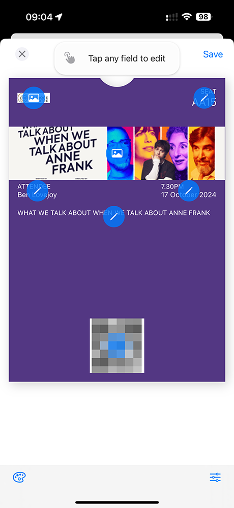 One minor gripe is that the graphic aspect ratio is fixed, and you can see the problem with that in my sample pass, which cuts off the title of the play. Longer-term, I’d like to see AI used to automatically extract details from an e-ticket in order to select an appropriate template and auto-populate the fields, but for now a manual option is a lot better than nothing.