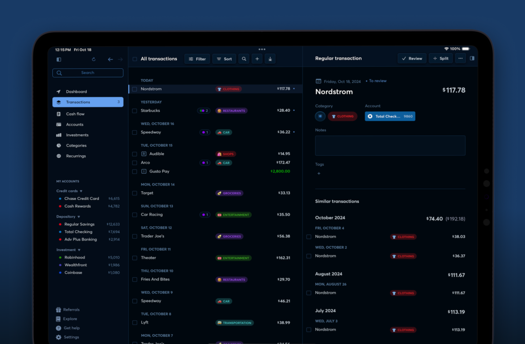 Copilot hasn’t just ported the iPhone app to the iPad but rather meticulously optimized the experience to ensure it feels right at home on the iPad. Copilot for iPad features a sidebar that can easily be hidden with a single tap. You can quickly navigate between the different tabs of the app, such as Transactions, Cash Flow, Accounts, and more.