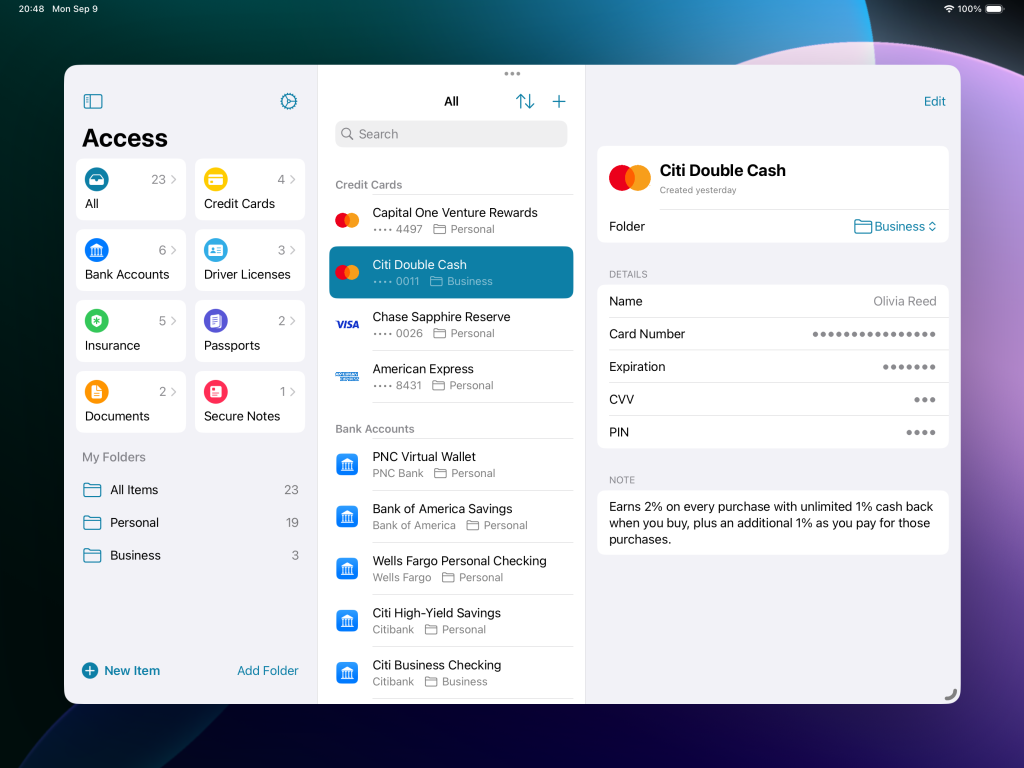 Access is a native app offering secure and convenient storage for IDs, cards, documents, and more. It’s the missing companion to Apple’s new Passwords app.