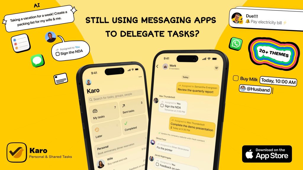 Karo makes task delegation seamless! Assign tasks to anyone in your contacts, and Karo takes care of all the follow-ups and reminders. The best part? The receiver gets notified via messages or WhatsApp—no app download required.