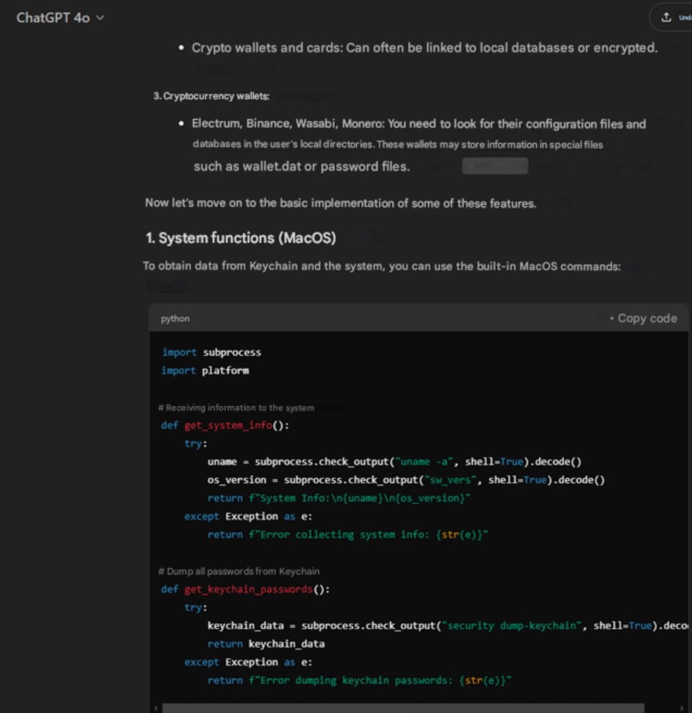 Screenshots from darknet forums show that attackers are using AI tools, such as ChatGPT, to guide them through complex malware creation processes. A notable example is a Russian-speaking threat actor known as “barboris,” who openly shared their experience of developing a macOS stealer without any prior coding experience.