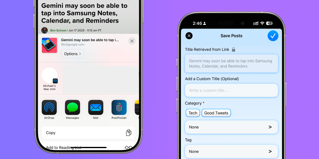 Once you’re in PostPocket (from within the share sheet), you can just save the post as is, or you can choose to apply a category, tag, or custom title in the moment. Categories give you an easy way to sort from within PostPocket, and tags allow for additional granularity within a category. PostPocket offers a ton to help keep your varying links organized.