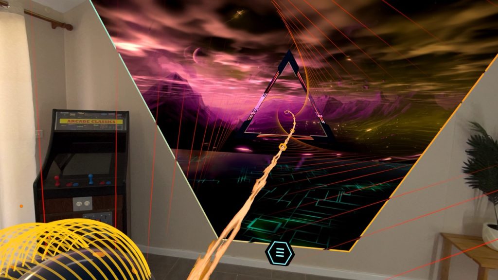 Synth Riders Experience offers two modes on Apple Vision Pro. The first is a mixed reality view that creates a portal for gameplay while showing your real world environment. The other is a fully immersive experience that transports you to another musical dimension.