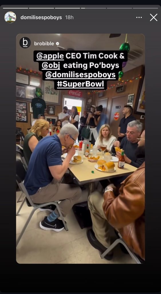 Separately, the head of Apple dined with Odell Beckham Jr. and Apple services boss Eddy Cue at Domilise’s Po-boys & Bar to enjoy a signature Gulf Coast meal: