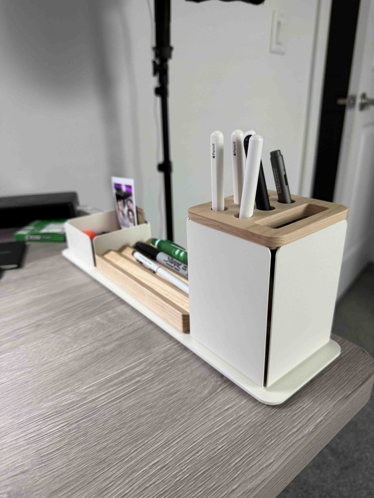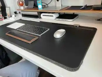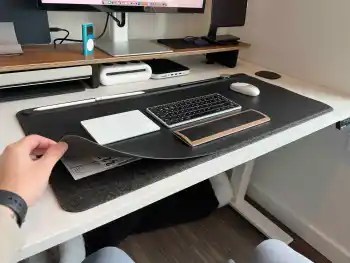 This desk mat is truly a game changer, offering multiple functions. First off, it features high-quality vegan leather that not only elevates your workspace but also provides a smooth surface for all your peripherals, making mouse movements easy. There is also this clever railing along the top of the mat, which includes a magnetic divot for securely holding your Apple pencils so they never get lost, plus a magnetic cable organizer. The design extends to its layered construction, with a felt bottom that protects your desk from smudges while giving you a handy spot to store loose-leaf items like brochures and printouts. It’s cool how companies continue to innovate with something as simple as a desk mat. It comes in multiple colors and sizes as well!