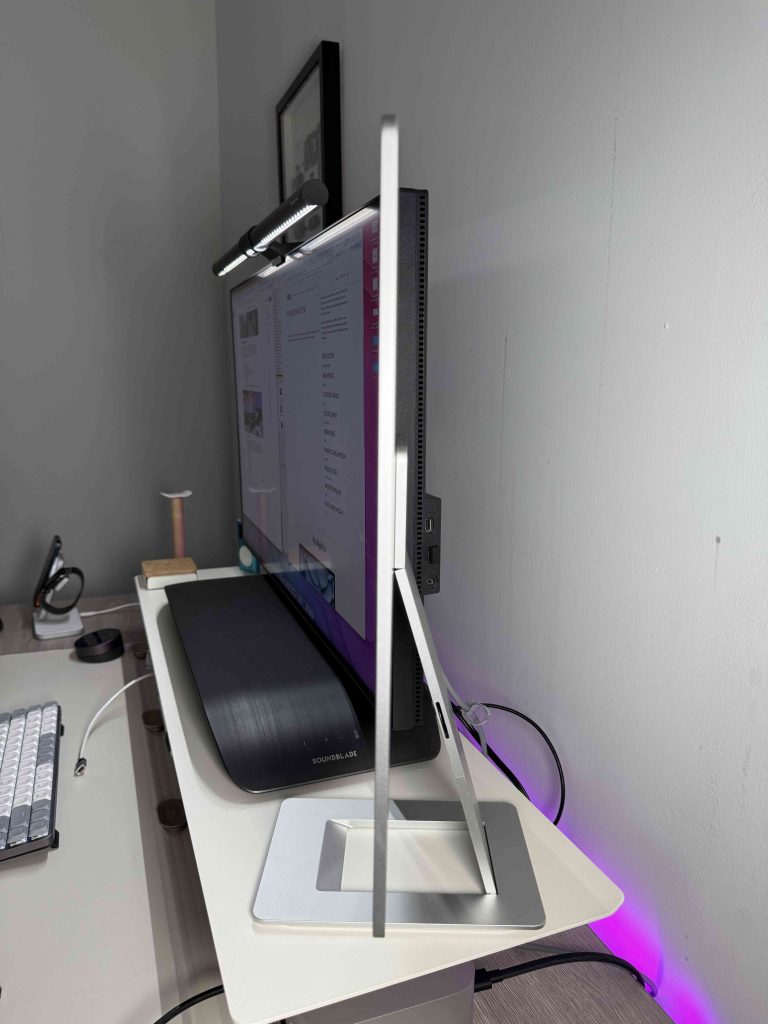 I have my Sonos Ace headphones, which are currently $100 off, for when I need to lock in and block out noise, but if I wanted to play something out loud, I needed something. I wanted to avoid the usual stereo speaker setup. That is where the Soundblade comes in. The form factor is extremely unique. It was meant to be used with the iMac as a monitor riser and speaker combo, but for my setup, it fits perfectly on my Ugmonk monitor riser.