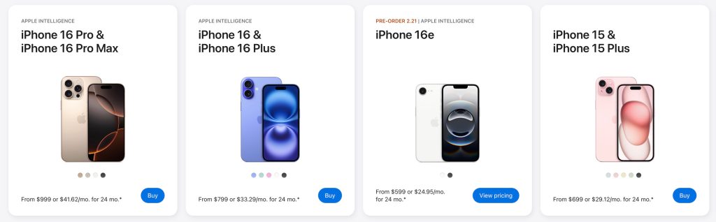 There’s the iPhone 16 Pro from $999, the iPhone 16 from $799, the iPhone 16e from $599, and the iPhone 15 from $699. From most expensive to most affordable — except for the iPhone 15, which is oddly priced in the lineup.
